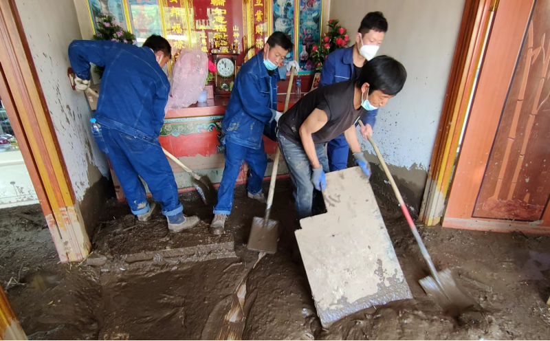 在救災(zāi)現(xiàn)場(chǎng),公司抗洪救災(zāi)突擊隊(duì)和先鋒隊(duì)員,充分發(fā)揚(yáng)“不怕苦、不怕累,敢奉獻(xiàn)、勇?lián)?dāng)”的精神,按照“8.18”山洪災(zāi)害搶險(xiǎn)救援處置工作應(yīng)急指揮部的統(tǒng)一安排,迅速投入到清除淤泥和道路清障等工作。大家不間歇地用鐵鍬清、用架子車?yán)?,兩天共清理十家住戶和三戶商鋪的屋?nèi)外淤泥,裝運(yùn)泥漿20余噸。