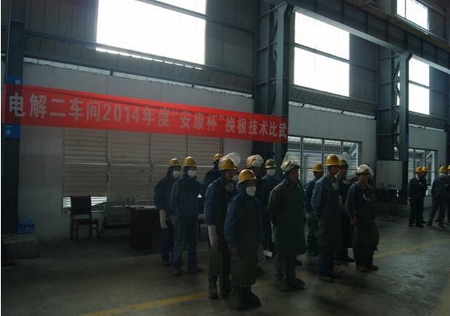 青海物產(chǎn)工業(yè)投資有限公司全面啟動(dòng)"安康杯"競(jìng)賽活動(dòng)。2014年4月15日上午電解二車間舉行了"安康杯"換極技術(shù)比武大賽。公司副總經(jīng)理張?jiān)手遥笨偨?jīng)理、工會(huì)主席張秉瑜,總經(jīng)理助理秦建峰出席了開幕式。