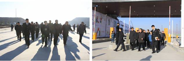在保稅物流中心卡口上方"青海曹家堡保稅物流中心"以中英文兩種字體呈現(xiàn),海關(guān)標識赫然醒目。王黎明副省長一行在實地查看了1#、2#保稅倉庫、卡口、查驗庫、辦事大廳等設(shè)施,并邊走邊聽取物產(chǎn)集團總經(jīng)理王玉輝關(guān)于工程施工進展情況的匯報。