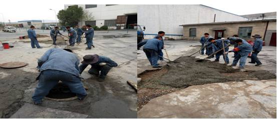 時至夏日,天氣多變。臨時土建維修隊(duì)充分發(fā)揮車間人員中懂得土建施工技能的優(yōu)勢,悉心謀劃,從職工家中借用攪拌機(jī)等施工機(jī)械,加班加點(diǎn)有序進(jìn)行著屋面防水修復(fù)、路面地基處理、排水溝的修復(fù)等維修工作。在公司車隊(duì)密切配合下,截至6月4日共修復(fù)屋面防水358平方米,路面維修290平方米、路基整修87立方米,排水溝修復(fù)15米,生產(chǎn)廠區(qū)道路破裂,瀝青澆灌等各項(xiàng)工作。