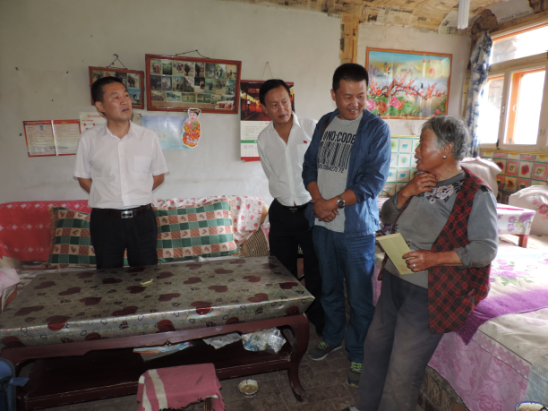 朝物開投公司副總經(jīng)理喇軍民、物產(chǎn)汽貿(mào)公司董事長張建軍、機(jī)電市場公司市場部部長王功明以"三幫一"的方式結(jié)對幫扶絕對困難戶楊生福。楊生福,男,藏族,61歲,家中三口人,本人肢體四級(jí)殘疾,妻子四級(jí)殘疾(羅鍋),兒子30歲,現(xiàn)安排在當(dāng)?shù)貜氖伦o(hù)林員工作,未結(jié)婚,住房為土木結(jié)構(gòu),此次結(jié)對幫扶為其送去了600元慰問金。