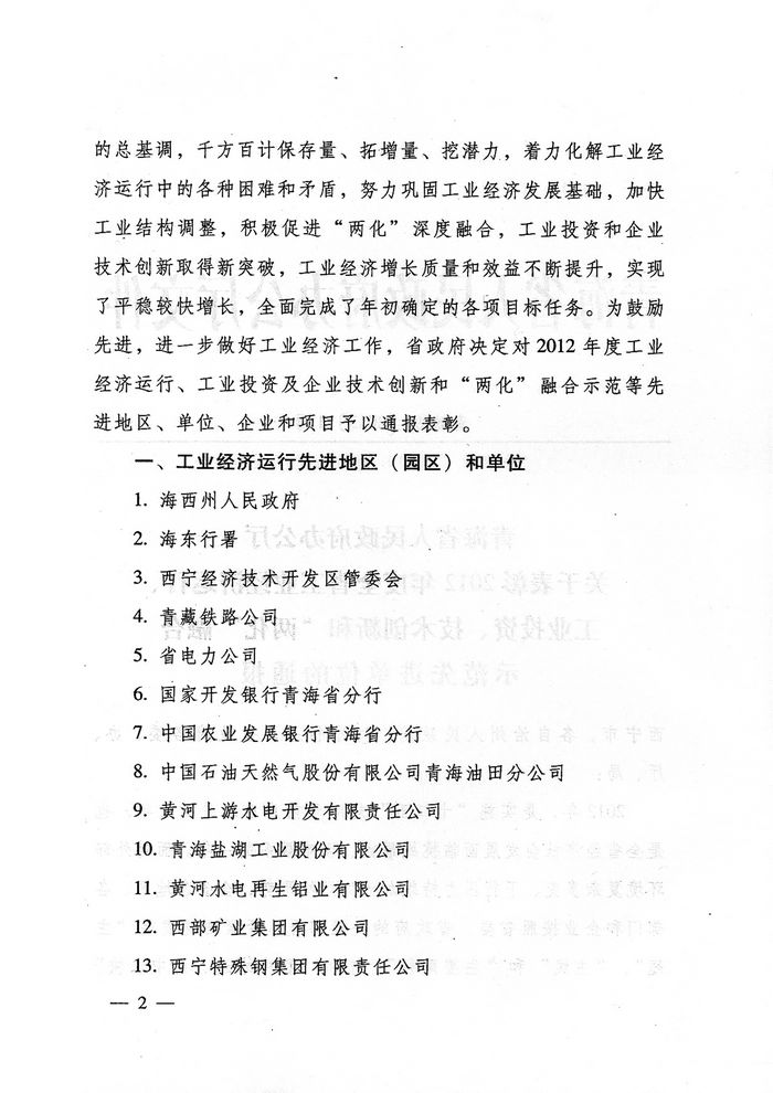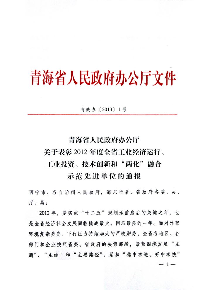 集團(tuán)榮獲2012年度青海省人民政府“工業(yè)投資貢獻(xiàn)獎(jiǎng)”